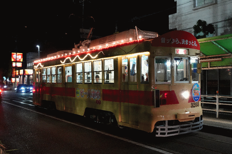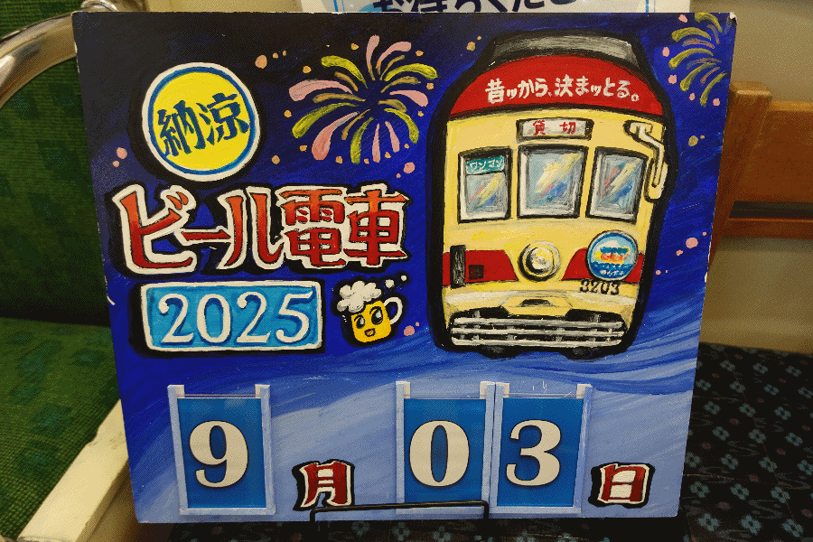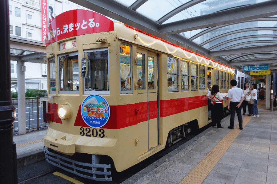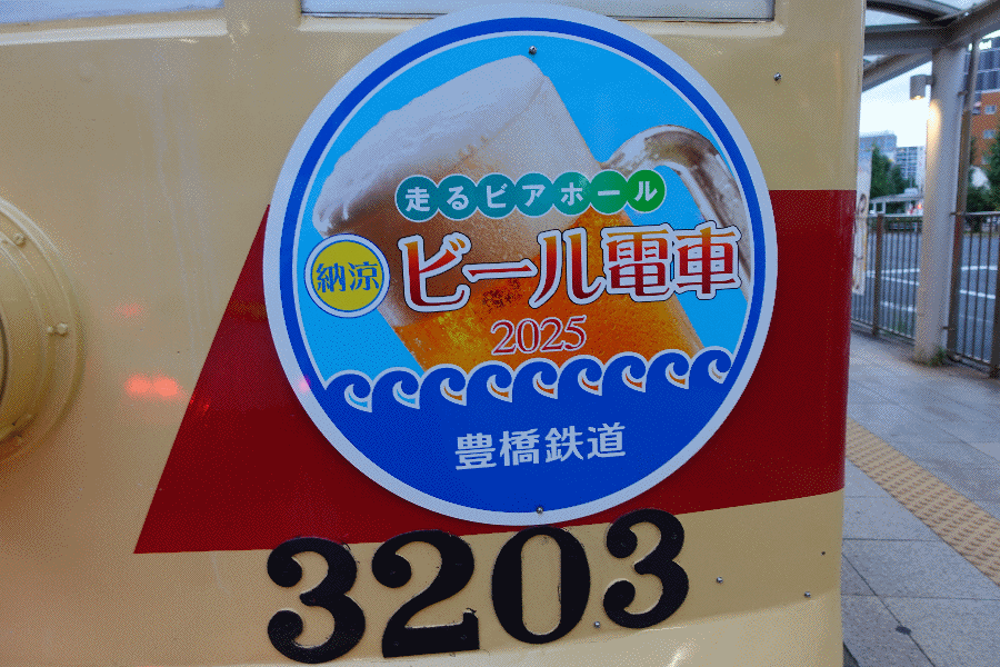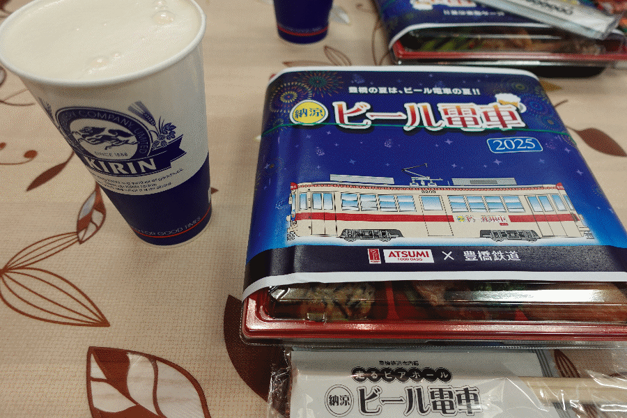 まずは、豊橋鉄道の「納涼ビール電車」である。豊橋鉄道の市内線では、ビール電車以外にも「おでんしゃ」などを季節に応じて走らせているが、いつもすぐに予約が埋まってしまう(小さい路面電車であるため、座席数が28と少ない)。団体さんに私1人だけ混ざってもバツが悪いと思って遠慮していたが、乗車できる観光列車の選択肢もだいぶ少なくなってきたため、予約開始日を狙って1席取ってみた。ビール飲み放題に特製おつまみ弁当が付いて、5,200円也。