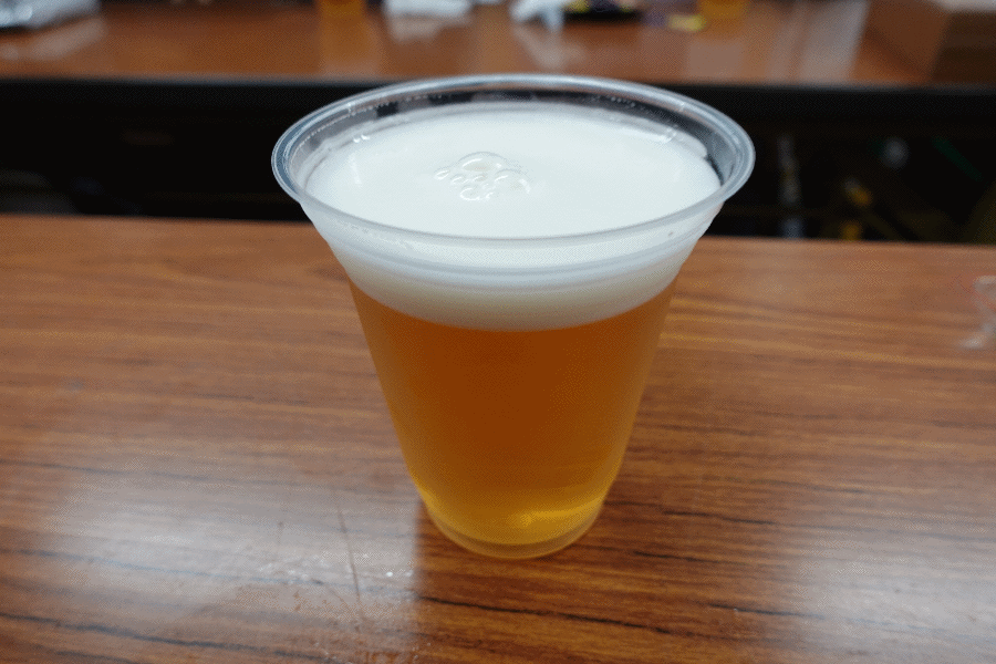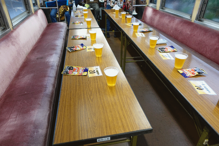 私の席は、一番奥(運転席に近い場所)であった。通常の鉄道車両であれば、テーブルとテーブルの間に係員が歩くスペースがあるが、狭い路面電車であるため通路は無く、ビールは乗客が手渡しで机の奥まで送る方式となっている。
