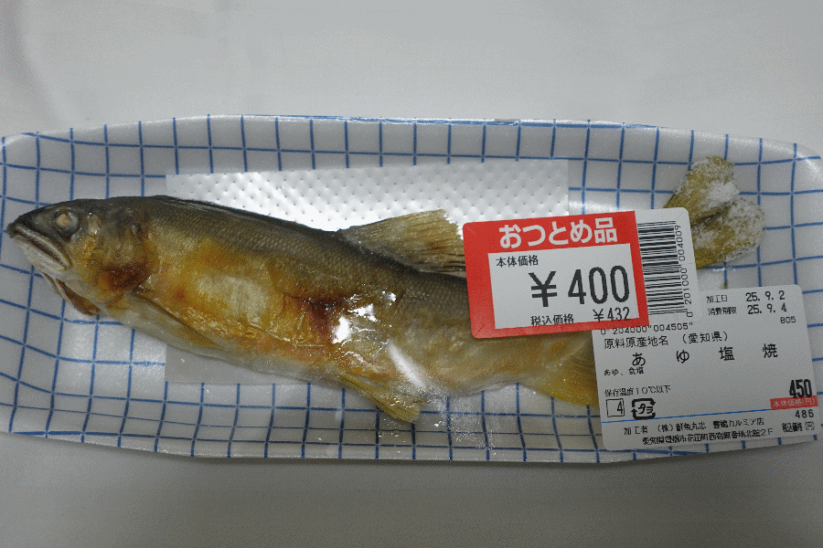 安ホテルのチェックインは16時からであるため駅ビルを適当にブラブラしていると、地元愛知産の鮎が値引きになっているのを発見した。今日のビール電車は持ち込み可能であるため、取り急ぎそれを買ってみた。
