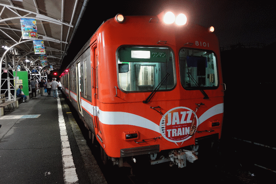 17時24分、吉原を出発した。すぐに演奏が始まり、車内は大盛り上がりである。ジャズ好きの常連さんも多いようで、また、地元の新聞記者も乗り合わせて撮影や取材などをしていた。