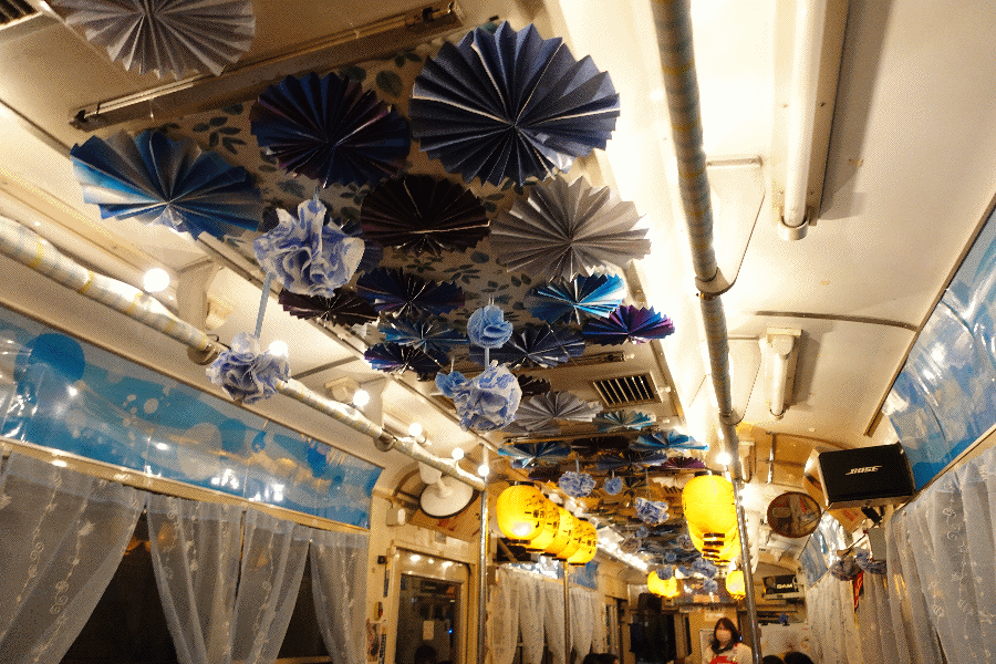 ずっと盛り上がっていた車内であるが、工場が多い区間になると、車内のライトが消えて「夜景電車」モードとなった。