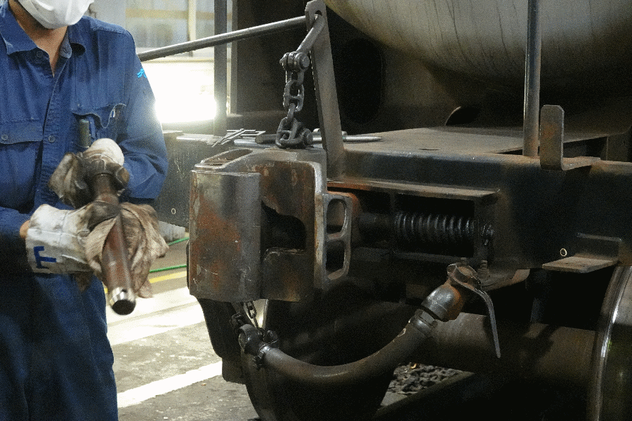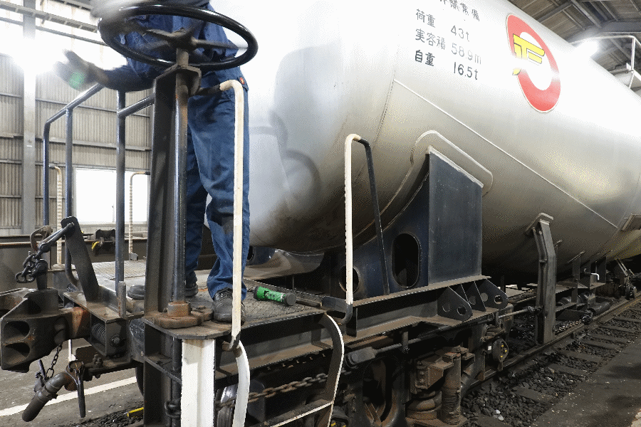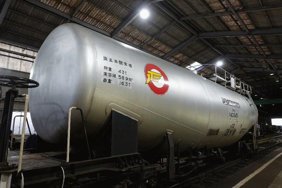 続いて案内されたのは検修庫である。待ち構えていたのは、日本に1両しかないレア貨車、通称「銀タキ」と呼ばれているタンク車である。