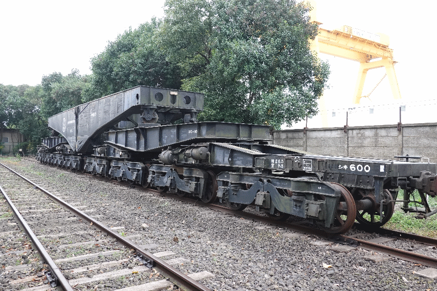 奥まった場所まで歩いて、線路がスイッチバックをした一番奥に係留されているのが、ここでのメイン車両であるシキ600である。発電所などで使用される巨大な変圧器を輸送するための車両であり、もちろん国内に存在するのは1両だけである。そしてもちろん、現役ではない。それにしても、巨大な車両である。