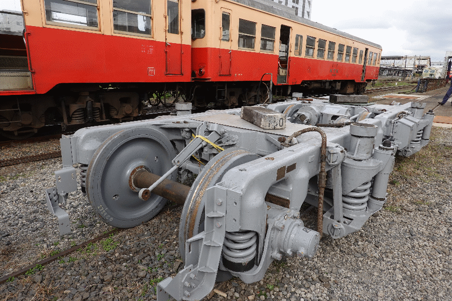 続いては、台車などが置いてある場所へと移動した。手前に置いてあるのはJRから譲り受けたキハ40の台車である。キハ40を譲り受ける際にはいくつか条件を提示したそうだが、そのうちの1つが「コイルバネであること」だという(コイルバネだと現有の車両と同じ整備ができるが、空気バネだと部品の入手等で複雑になるため)。