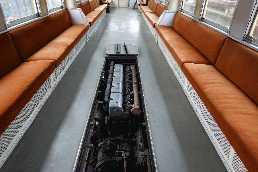 また移動して、最後はディーゼルエンジンの始動である。車内の床が開けられた状態になっていてエンジンが見える状態になっており、すぐ目の前でエンジンが始動された。縦置きのエンジン(ピストンが上下移動する)であるため車高が高くなってしまうが、確かに入口でワンステップ上がる必要がある。なお、このエンジンの部品もあと10年くらいしか在庫がないため、そうなるとこの車両自体もそれまでの寿命なのかもしれない。