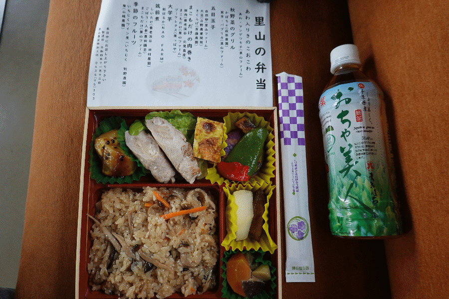 今日の昼食は、里山弁当である。肉巻きや五目玉子など、地元の食材が中心であり、優しい味がする内容であった。