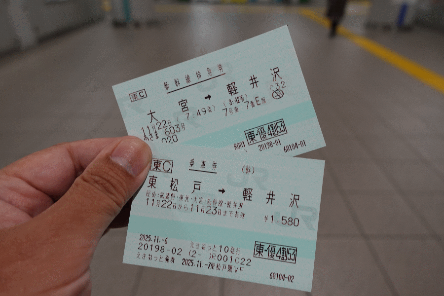 往路は軽井沢まで新幹線で移動して、復路は横川から在来線だけで戻ってくることにしている。JREバンクの優待券(4割引)がちょうど2枚残っていたため、それを使って移動することにした。