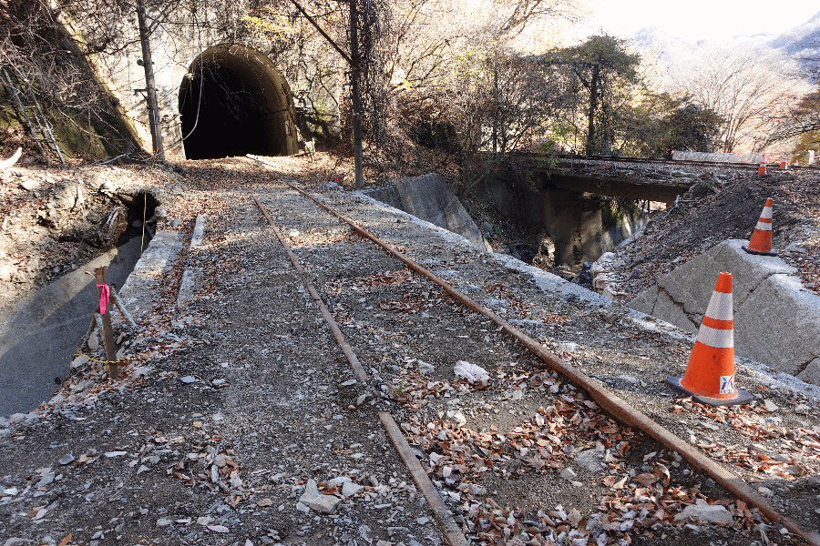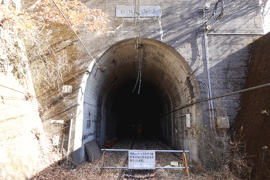 食事後は、ツアーの再開である。ここ旧熊ノ平駅までは旧線を整備した「アプトの道」を通って峠の湯方面から歩いて来ることができるが、今日はそれではなく、引き続き廃線後そのままとなっている新線のトンネルを歩くこととなる。