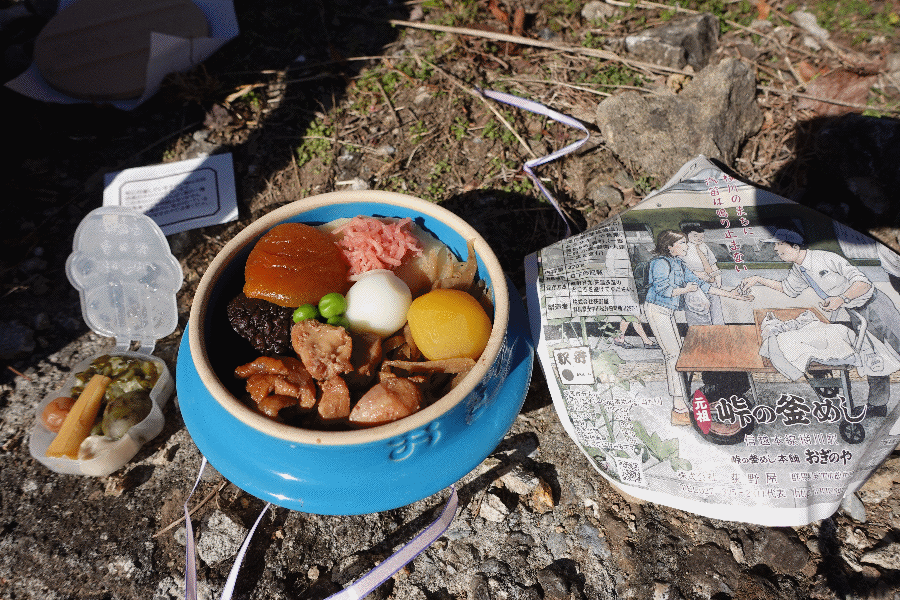 5号トンネルを抜けると、旧熊ノ平駅である。ここで、昼食休憩となる。今回のツアーには峠の釜めしが付いてくるが、通常とは違う特別なカラーバリエーションである。