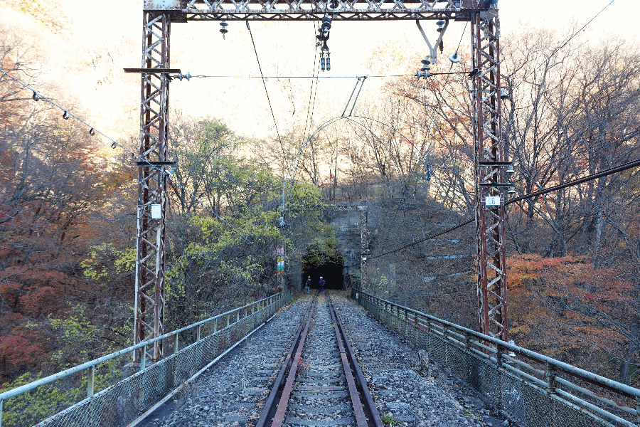 色々な説明(事故を起こした機関車が残したトンネル傷など)を聞きつつ歩き続けてすべてのトンネルを走り終わり、後は峠の湯まで路盤上を歩くだけである。