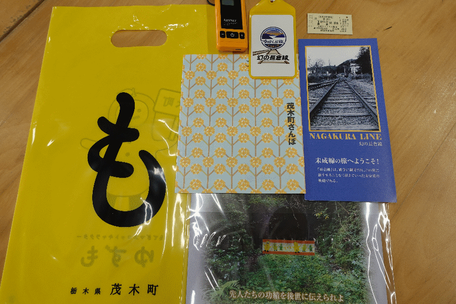 もう1つが、茂木町が主催してJTBで申し込みができるものであり、未成線(完成しなかった路線)である長倉線を辿るものである。正式名称は「秋の里山を満喫! 未完の鉄路「長倉線」を歩くガイド付きツアー(踏破コース)」であり、普段は立ち入り禁止となっているトンネルにも入ることができるツアーである。硬券切符やガイドブック、おにぎり弁当や和菓子が付いて、7,000円也。