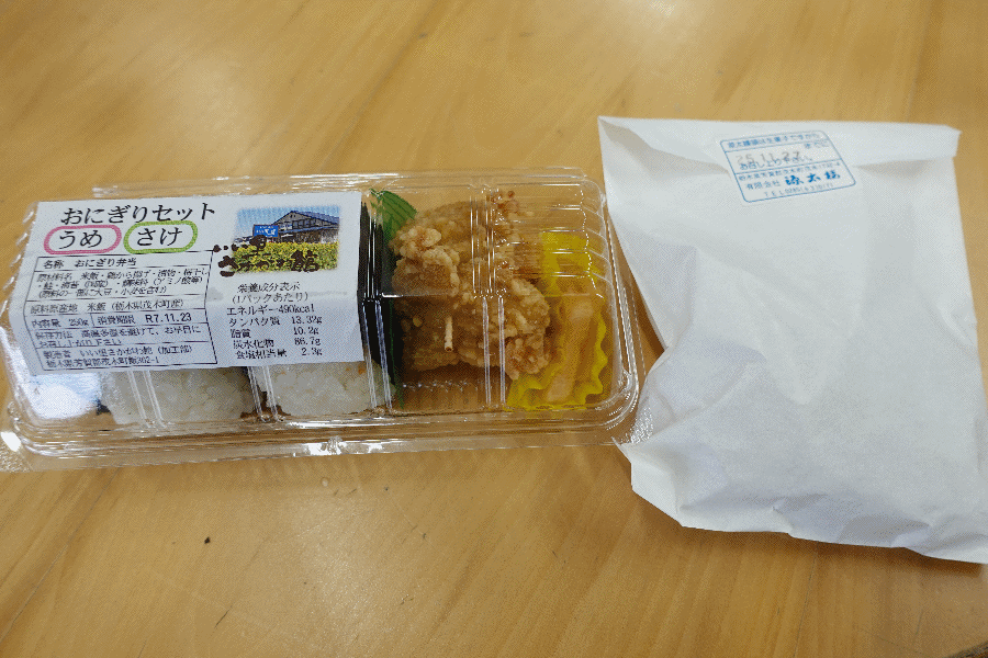 続いて配られたのが、お昼用のおにぎり弁当と和菓子である。和菓子の中身は、お饅頭であった。