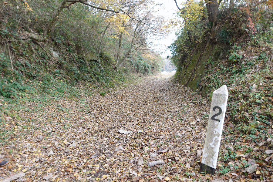 しばらく車道を歩いて行くと、長倉線の跡が見えてきた。路盤は、歩きやすいように整備されている。それなりの勾配があり、20パーミルであるという。昨日の66.7パーミルほどではないが、SLで上ろうとすればかなり労力を要する勾配である。