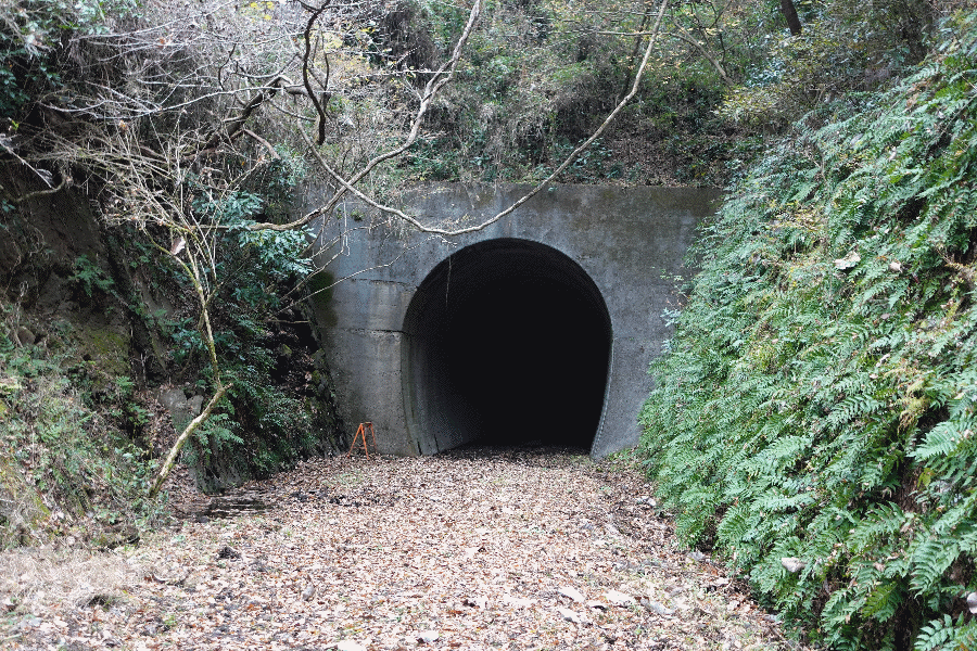 その後も歩き続け、アーチ形の橋や、ノミの跡が残っている切り通しを通り過ぎて、今回のツアーでのメインとなる大峯山トンネル(通常は進入禁止)に辿り着いた。トンネルに入る直前に、ヘルメットと懐中電灯が配布されている。