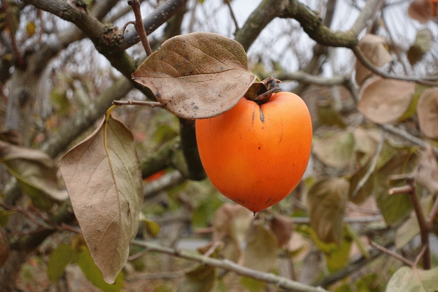 昼食休憩も終わり、引き続き長倉線跡を歩き続けた。沿線では、干し柿用の柿がちょうど収穫期であり、農家さんが大きなハサミで実を摘んでいた。