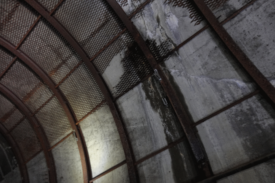 しばらく歩くと、鉄筋で補強されている部分が現れてくる。ここは、決して崩落しているという訳ではなく、実はこの上を北陸新幹線が走っているのである。