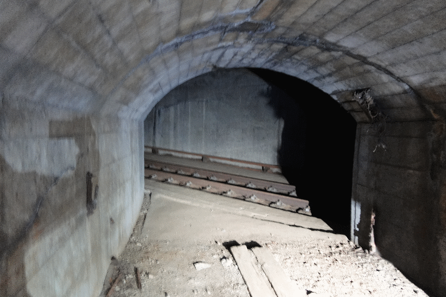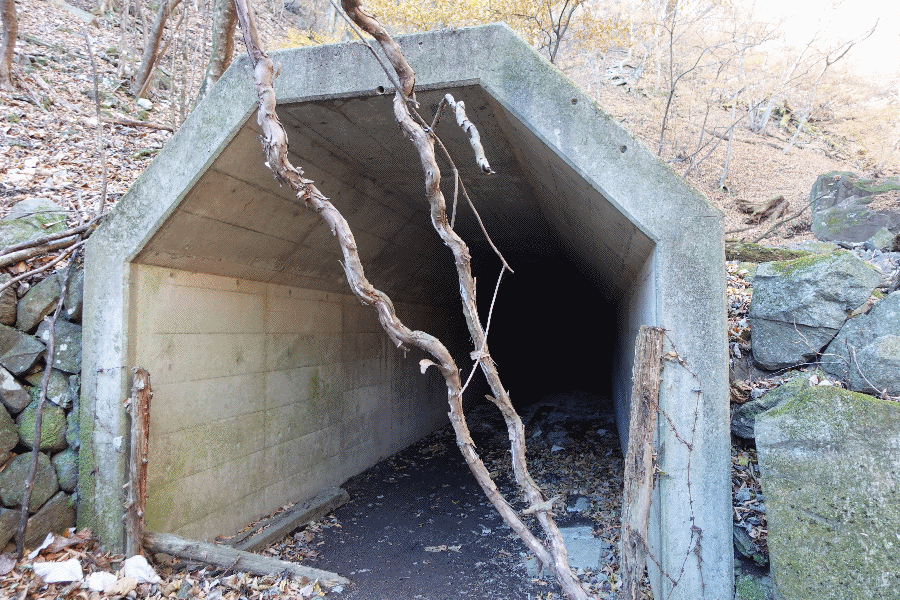懐中電灯を点けながら歩いていると、長いトンネルであるため、途中で工事用の斜坑出口(トンネル工事用に物資等を搬入する別のトンネル)が現れてきた。そこを通って外に出ると、今はもう、工事用の車両など近づけない荒れ放題の場所である。