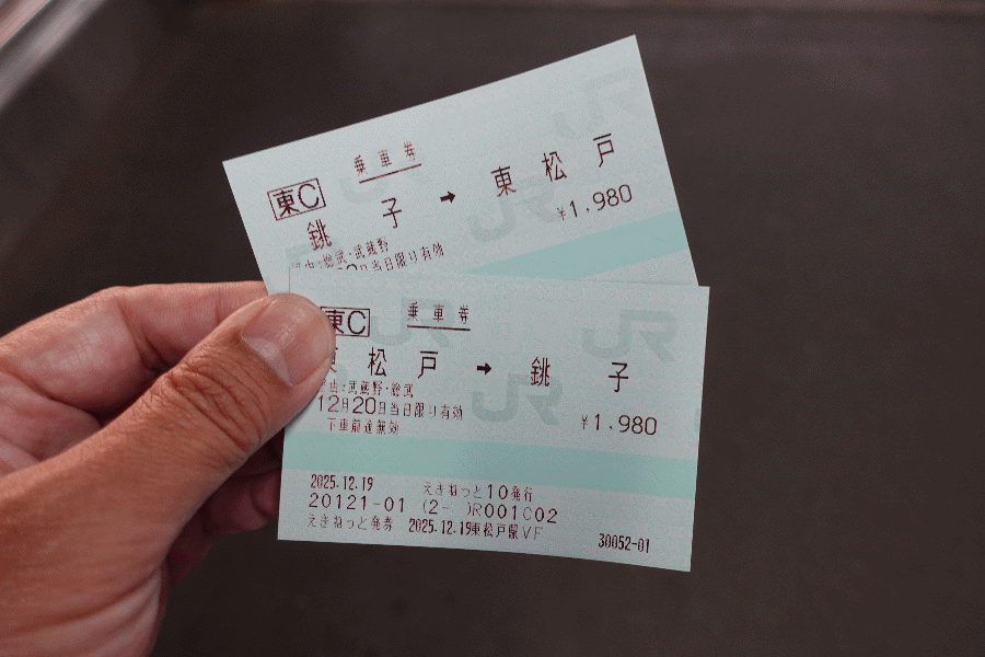 銚子までは、JRでの往復となる。昔の青春18きっぷであれば1日分だけを使うところであるが、今は3日連続か5日連続の切符しかない。サンキューちばフリーパスも対象外の季節であるし、大人の休日倶楽部の割引切符も距離的に満たない。ということで、普通の切符を購入した。