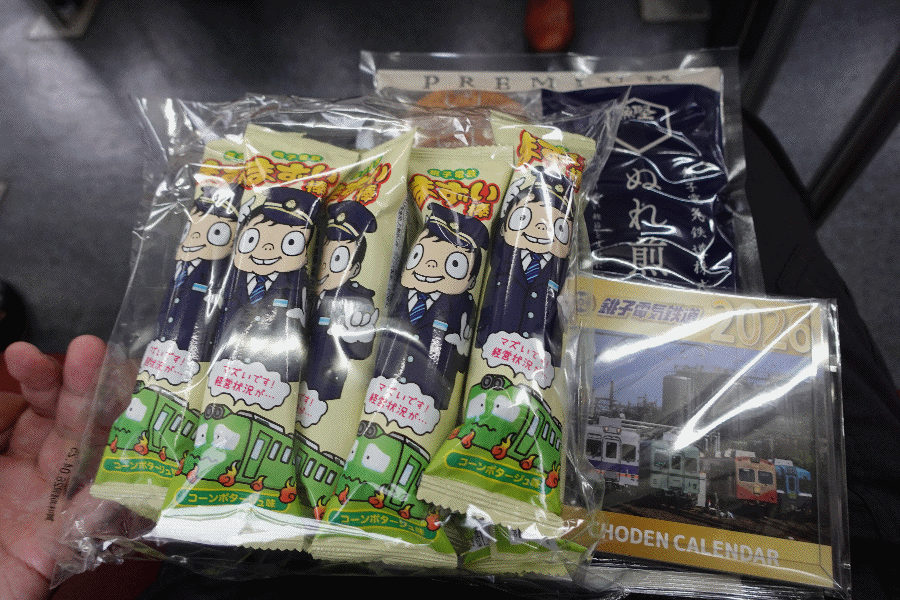 この手のものは良い結果が出ないのが常であるが、今回は珍しくかなり早め(4番手くらい)にビンゴが揃った。おかげで、最も人気があったであろう銚子電鉄セット(まずい棒10本、ぬれ煎餅10枚、カレンダー)を希望して頂いた。