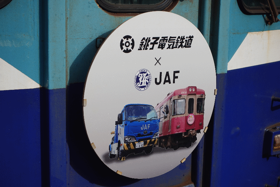 古い車両が係留されているが、その奥にある車両が、今日の「銚電JAF号崖っぷち行」である(ヘッドマークが付いているので判別できる)。車内では、準備をしているようであった。