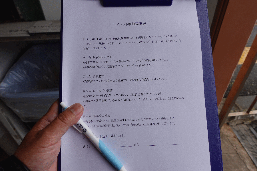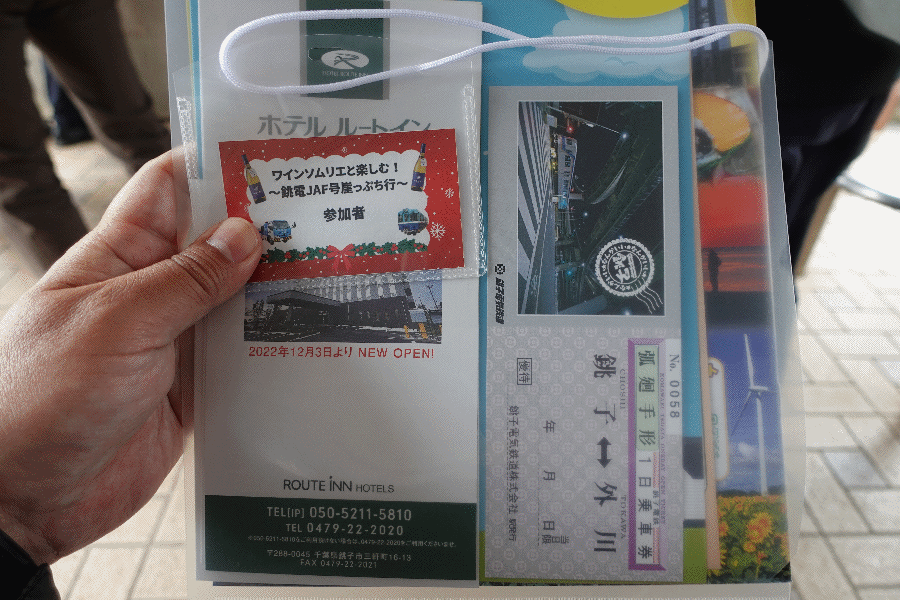 12時15分頃、改札を通って銚子電鉄の乗り場に向かった。名前を告げて、最初にすることが同意書(飲酒運転をしないことなど)への署名である。この手の観光列車でこういう書類に署名をするのは初めてであるが、おそらくJAF(日本自動車連盟)が主催しているからであろう。「JAF主催のイベントの帰りに参加者が飲酒運転」では、洒落にもならない。