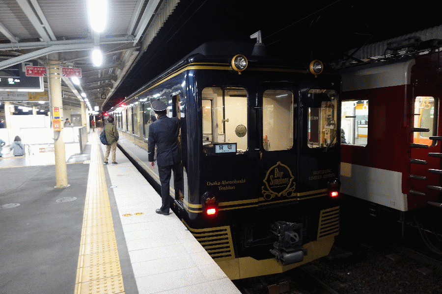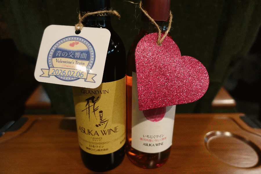 今回の食事付き観光列車は、近畿日本鉄道による「青のバレンタインTrain!」である。車両は観光用車両「青の交響曲(シンフォニー)」を使用しており、車内でワインとスイーツが提供されるものである。