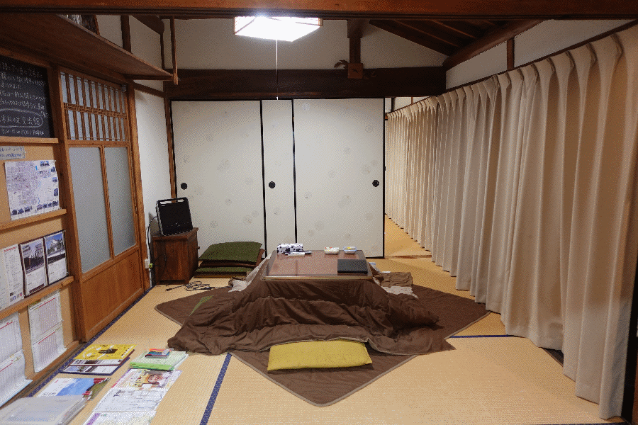 今日の宿は旧民家を改装したものであり、一応個室である(ふすまで隔てられているだけであるが)。共用スペースにはこたつもあり、田舎に帰った気持ちである。こたつに新今宮で買った食材を並べて一献して、今日は終了である。