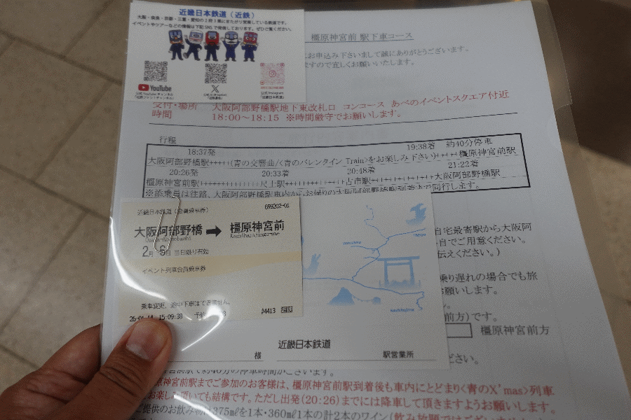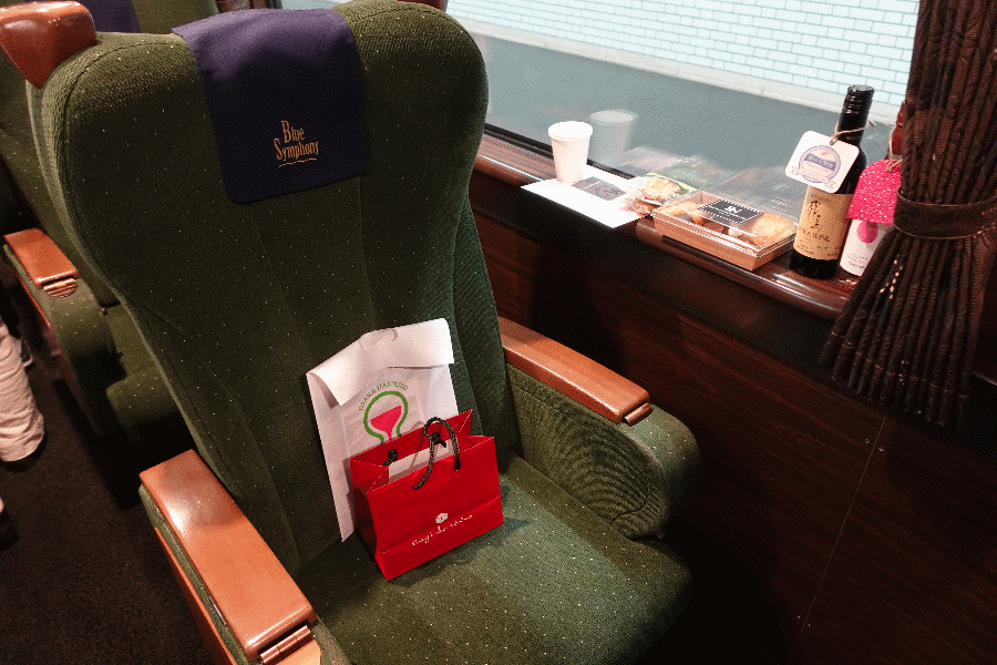 青の交響曲については、このシリーズの23回目で乗車している。ただしその際は、定期的に運行されている列車に乗って車内販売のカレーを頂いただけであり、無理やりこじつけた感じではあった。今回は、初めて「食事付き観光列車」としてのツアーである。車内ではワイン2種(いちじくワインと赤ワイン)が提供され、スイーツボックスとチョコレートが付いてくる。料金は下車駅によって異なるが、私は一番安い橿原神宮前下車のプラン(6,510円)を予約しておいた。パンフレットに「男性のみ、1名様でのご参加も大歓迎!」とあったのはご愛嬌である。