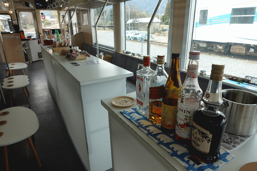 車両内にはバーカウンターが設置されており、案内役(歌も歌う)の方がいて、そして今日は酒蔵の社長も同乗しているという。運転手も含めて係員は3人いることになるが、なんと、乗客はまたしても私1人だけであった(延岡から高千穂も、高千穂から高森も1人であったのに)。