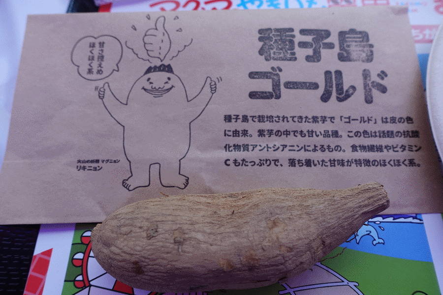 続いては「種子島ゴールド」である。外見は普通の芋であるが、中を割ると紫色の実となっている。なお「ゴールド」の所以は、生の状態での外見に因るという。