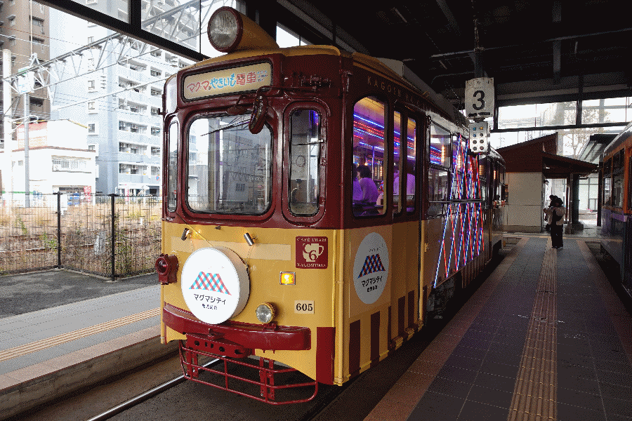 今回は、九州内で二つの食事付き観光列車に乗車してくる。鹿児島市交通局の「マグマやきいも電車」と、南阿蘇鉄道の「TRAIN BAR千本櫻」である。