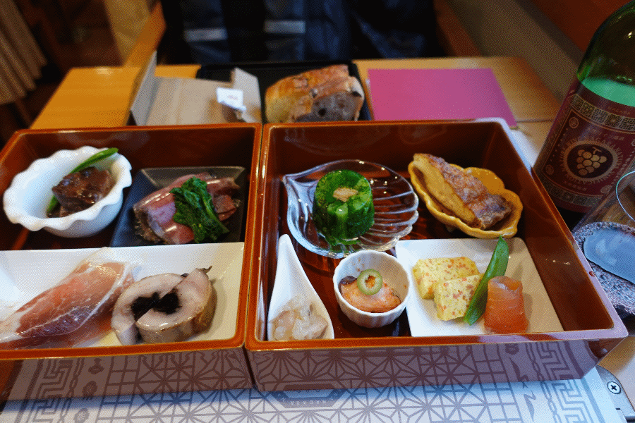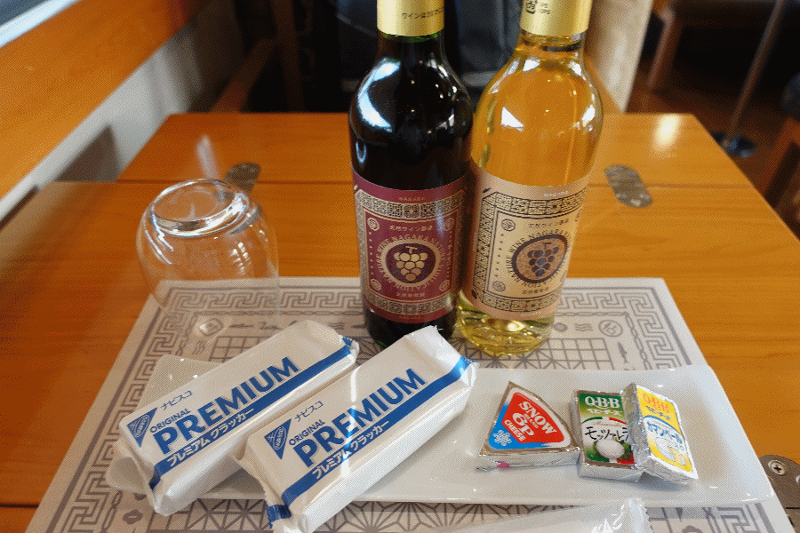 事前の案内では、前菜一式は復路で提供されると書いてあったので、往路がどうなるのか不明であった。「ワインをお楽しみください」と書いてあったのだが、ワインだけでは心許ない。実際には、クラッカーとチーズが添えられてあった。
