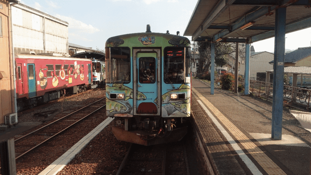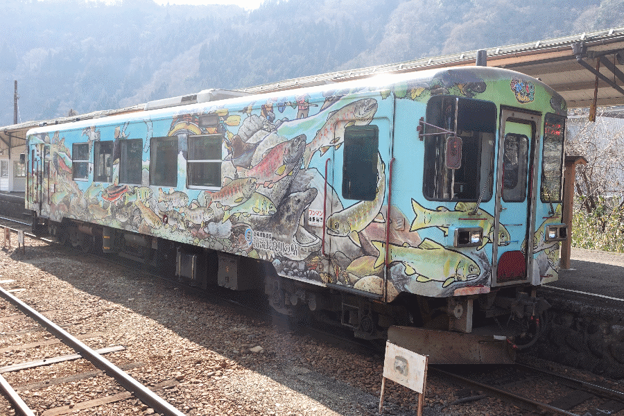 続いては13時27分発の列車に乗って、関方面に移動する予定である。折り返しその列車となる車両が入線して来たが、全体が鮎カラーであった。