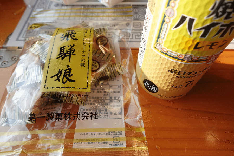 まずは、一献の開始である。スーパーで買っておいた岐阜のお菓子と、チューハイである。
