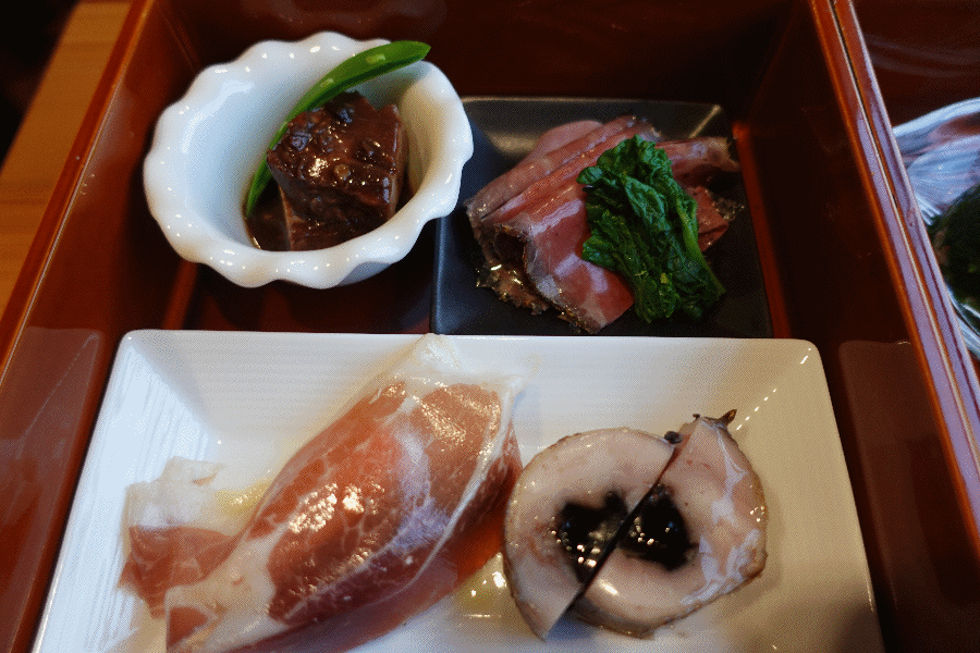 最初の重は、飛騨牛ローストビーフ、奥美濃古地鶏とトリュフのロートロ、ボーノポークのバルサミコ酢、生ハム・フォアグラ・フルーツ(柿)である。