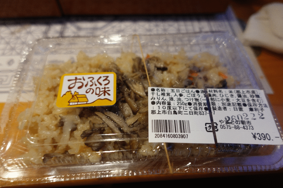 さて、この手の観光列車の料理は、量が「上品」であるのが常である(そもそも、今回は「前菜」がテーマである)。締めの一品であるが、郡上大和の物産館で買っておいた、きのこご飯である(これの横には「へぼめし」というのが売っていたが、なんと具材は蜂の子。珍しいが、それにチャレンジする勇気は無かった)。