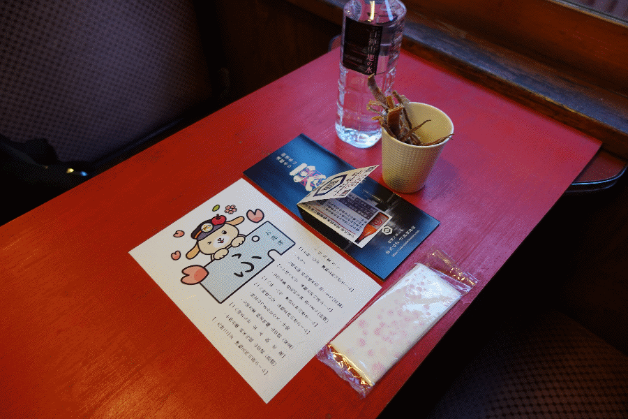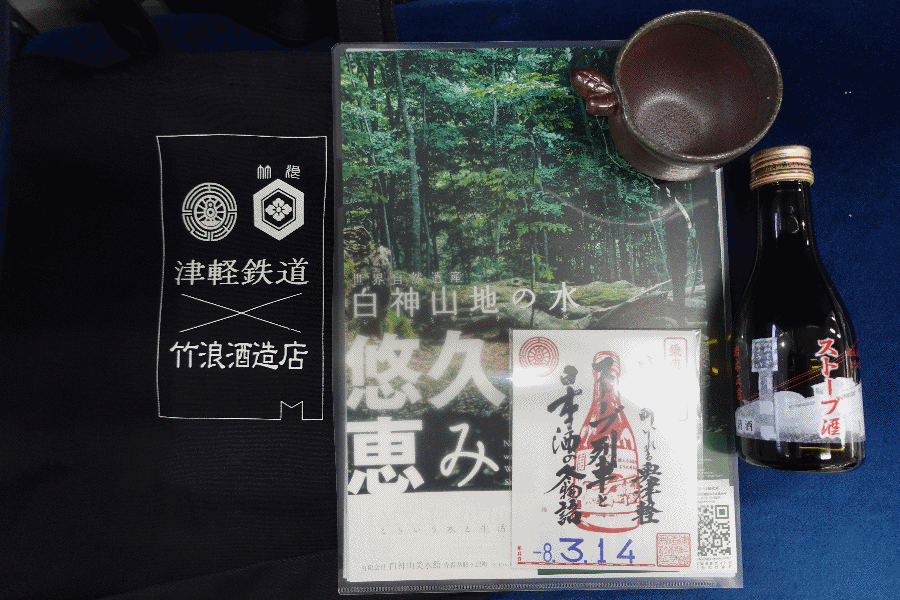 今回の食事付き観光列車は、初めての津軽鉄道であり、その名は「ストーブ列車と日本酒の冬物語」である。2025年12月から翌3月までの月に1回のみ(合計4回)の開催で、往路はストーブ列車内で日本酒2種とスルメを味わい、復路では日本酒2種におつまみセットを頂く内容である。その他、トートバッグやコップ、土産用日本酒や乗車証明書などが付いてきて、15,000円也。かなり早い段階に、3月14日出発分を電話予約しておいた。