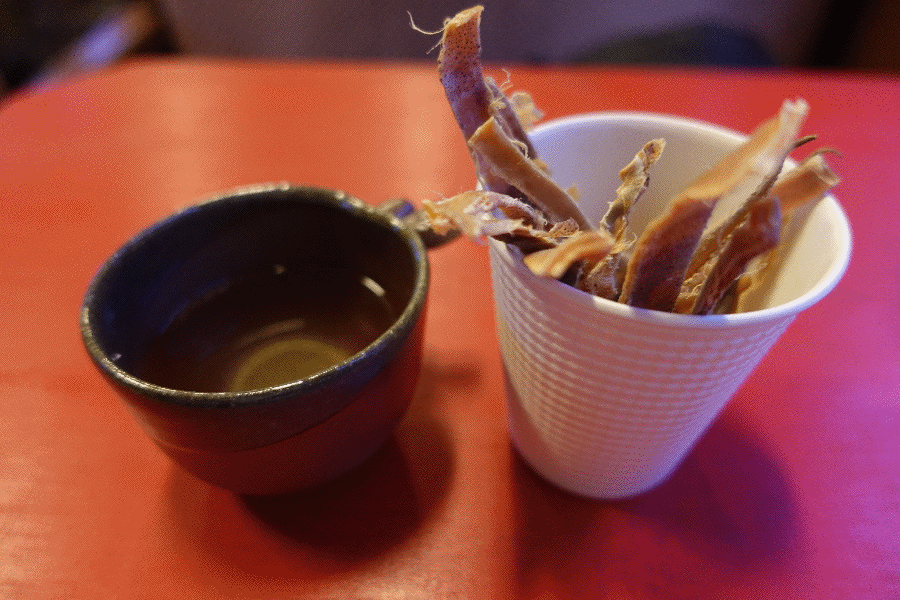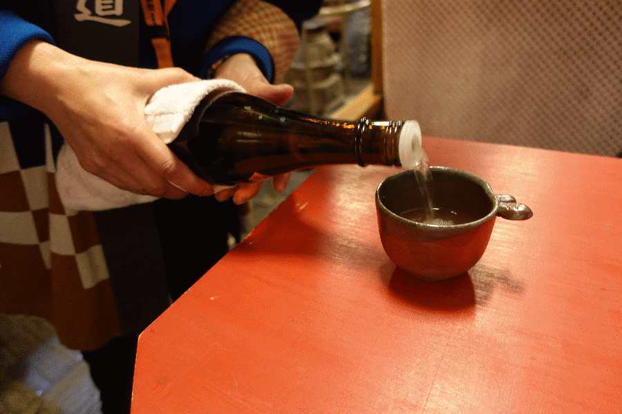 往路については2種類の日本酒をスルメで頂くが、正確には「1種類の日本酒を、常温と熱燗で頂く」という形である。酒蔵の方の説明によると、今日提供される日本酒は熟成されているものなので、ぜひ熱燗で味わってもらいたいということであった。