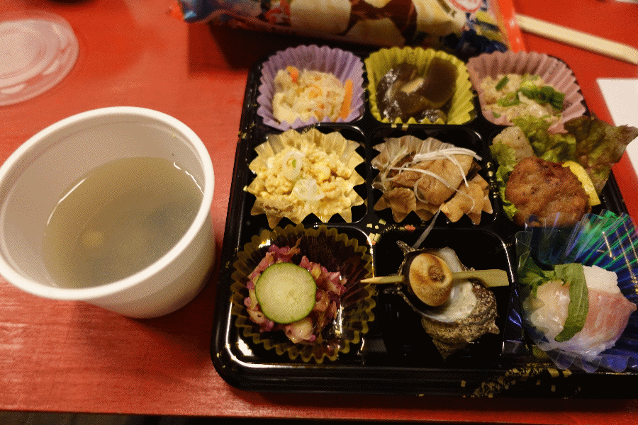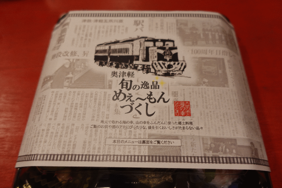 列車は動いていないが、タイムテーブルは予定通りとなっており、「津軽中里に着いたつもり」の時間になって、つまみのセットが配布された。