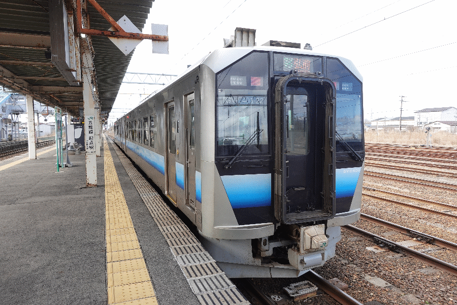 6時31分発の五能線で弘前に移動して、弘前からはロングシート車両でひたすら秋田に向かい、秋田からもひたすらロングシート車両で酒田に向かった。