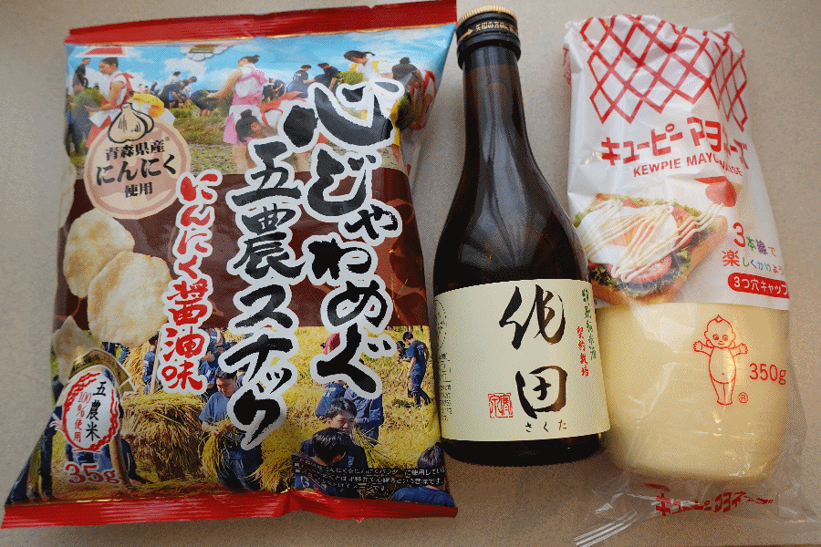 持ち込み用食材として、地元の高校とコラボしたスナックを買った。酒については、量が分からない(1杯だけなのか、お代わり有りなのか)ため、念のための追加である(なおこの心配は杞憂に終わり、手を付けることはなかった)。マヨネーズは、スルメ用である。