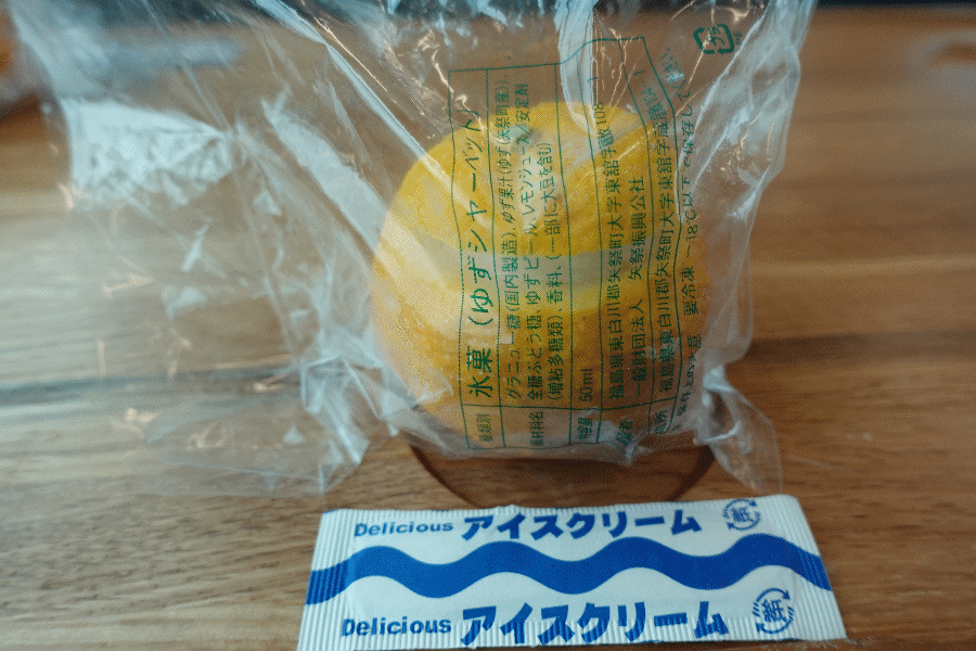 同駅を出発して、続いて提供されたのが矢祭町の「ゆずシャーベット」である。早速頂こうとしたが、新幹線のアイス以上にカチコチであるため、しばし放置してから頂いた。本物のゆずの器であり、料理等の再利用できるということなので、器は持ち帰ることにした。