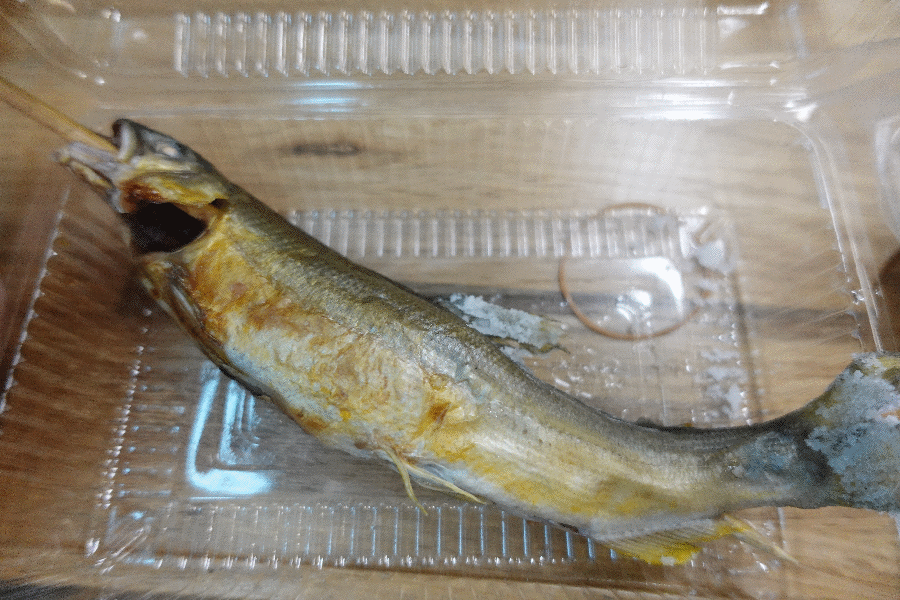それに続いて提供されたのが、同じく矢祭町の鮎の塩焼きである。矢祭山駅に11時59分に到着して(ドアは開かない)、地元の人がホーム上で旗を振ったりして出迎えてくれている。駅前には店舗があり、鮎はそこで焼かれたものであるという。