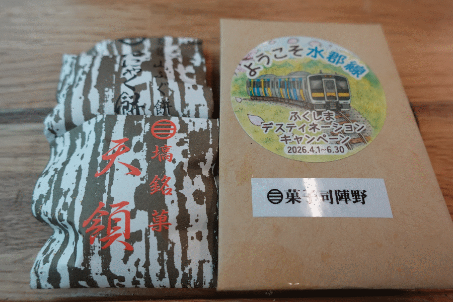 列車は磐城塙駅を出発して、続いての提供物は塙町の「山ふぐ餅」と「天領」である。山ふぐ餅は「こんにゃく餅」の愛称で親しまれているということであり、天領はきな粉や白ごまを練り込んで作られたものとのことである。