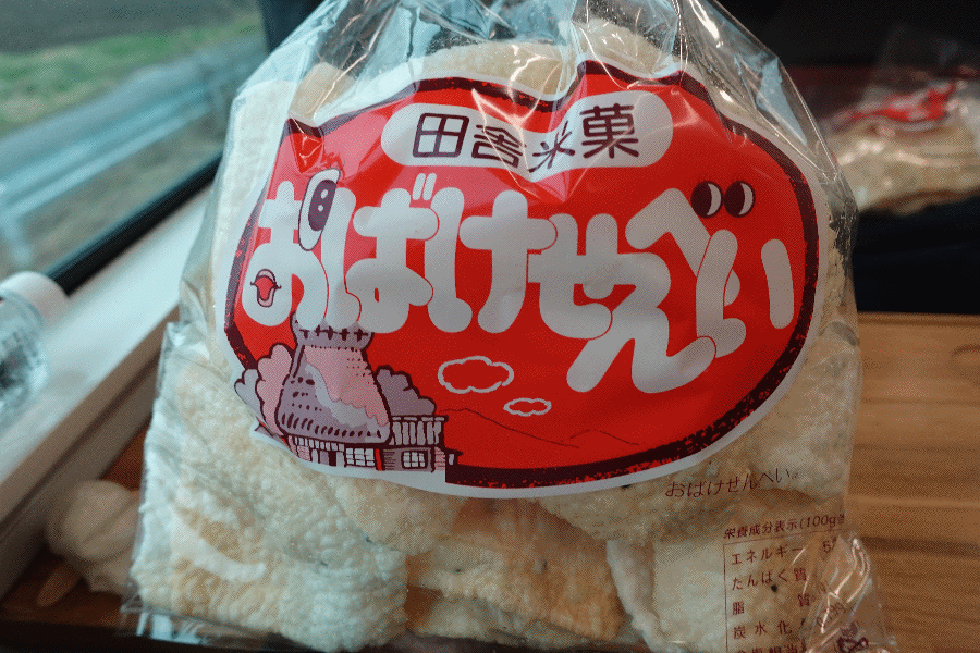棚倉町のものとして最初に提供されたのが、「おばけせんべい」である。両手に収まらないくらいの大きさであり、これはもうお土産としてお持ち帰りである。