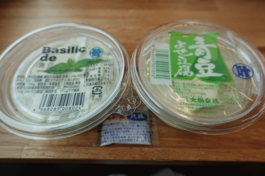 同じく棚倉町のものとして配布されたのが、「青豆よせ豆腐」と「バジルde青豆」である。前者は豆腐そのものであるが、後者はイタリア風にアレンジされたものであった。あら塩も一緒に配布されて、その塩で頂くスタイルである。