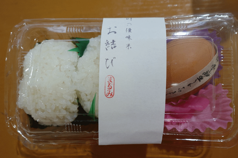 磐城浅川駅を過ぎて提供されたのが、「浅川の優味米おむすび」と「魔除けたまご」のセットである。魔除けたまごは、温泉たまごのように白身が緩いものであった。