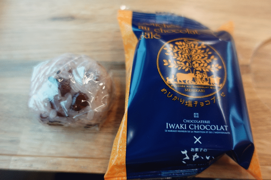 同じく石川町のものとして続いて配布されたのが、「めひかり塩チョコブッセ」と「すこやか餅」である。「めひかり」と言っても魚のあれが入っている訳ではなくて、めひかりの形をしたチョコがあり、それを使ったブッセ、ということである。