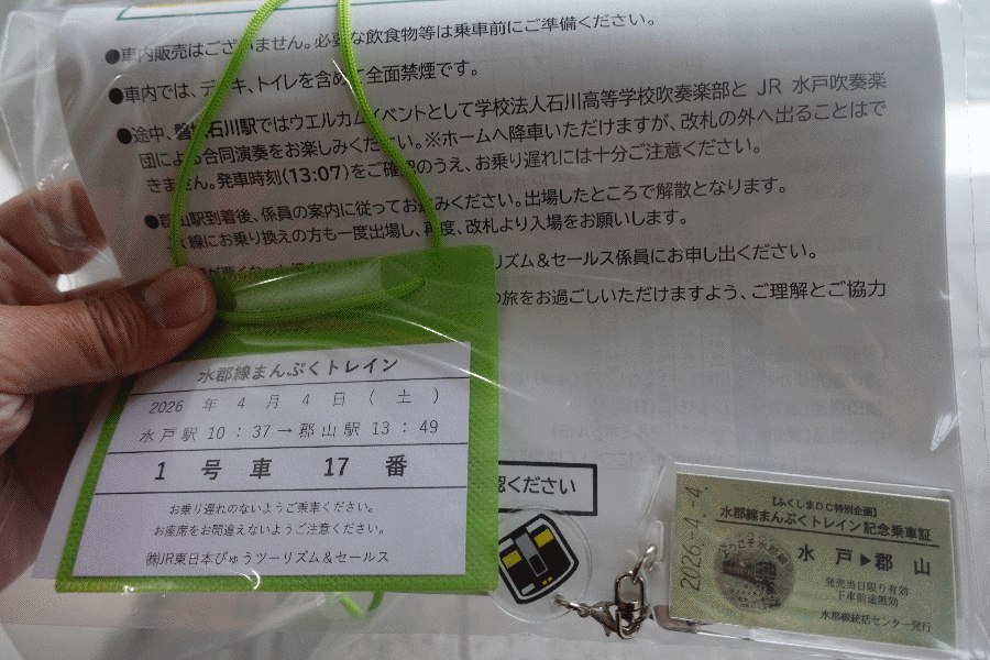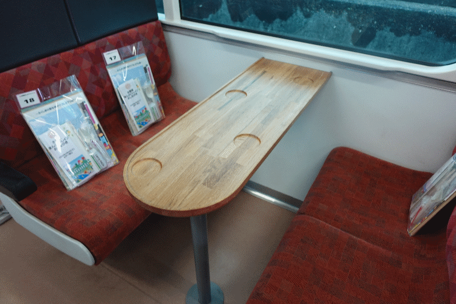 いつも通りの水郡線車両であるが、今日は特別にテーブルが付いている。私の席はボックス席で相席になっているが、幸いにも進行方向の窓側であった(これは景色が見やすい最適な席である)。椅子には、パンフレットやノベルティがたくさん詰まった袋が置いてあった。