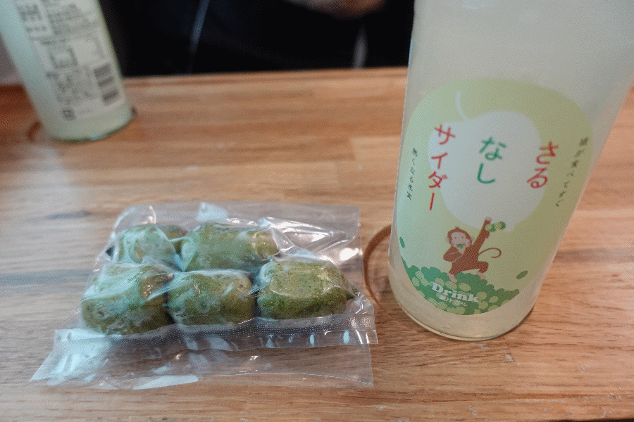 列車は玉川村に入り、そこで提供されたのが冷凍の「さるなしの実」と「さるなしサイダー」である。あまり馴染みがない果実であるが、キウイフルーツのような風味であった(小さいとはいえ、形も似ている)。
